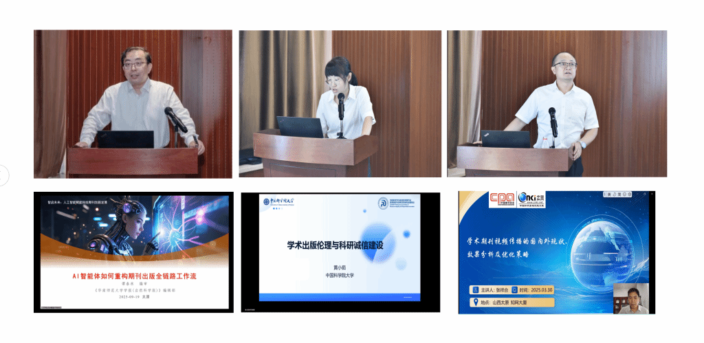 上海交通大学期刊中心主任谈毅教授从三个维度系统阐述了人工智能在学术研究与出版中的应用:AI for science(AI for research)、AI for writing 和 AI for publish。他指出,人工智能的应用已成为不可逆转的趋势,科研过程中亟需建立统一的AI使用规范。编辑应系统把握科研人员使用AI的全流程,并在期刊出版与运营中明确AI的应用方向,包括使用动机、方法选择、输出控制及成果应用等方面,以实现科学、规范地融合AI技术。华南师范大学学报谭春林编审结合自身实践,分享了AI在编辑工作中的具体应用,涵盖生成式AI概述、提示技巧、音视频处理、AI智能体以及使用伦理五个方面,生动展示了人工智能在编辑业务中的多元应用场景。中国科学院大学黄小茹教授围绕出版流程中的科研诚信建设展开探讨,从期刊在科研诚信中的责任、学术论文中的典型不端行为以及期刊在制度建设方面的举措三个角度进行分享。她强调,期刊应积极承担责任、细化相关制度、建立明确标准,切实维护科研诚信。北京中科期刊出版有限公司产品经理金荷颖介绍了SciEngine平台的发展现状与AI技术应用,以及AIGC未来的发展规划。该平台构建了覆盖论文投稿评审、内容结构化生产、数据存储、资源发布、学术提升、国际推广与科学评价等全流程的期刊数字出版与知识服务体系,并借助AI技术提升出版服务能力,如智能翻译加速期刊国际化传播、智能推荐审稿人及识别图像造假等。吉林大学学报副总编张祥合编审从科研诚信与伦理治理、生产效率提升与流程优化、内容创新与传播变革这三个科技期刊行业广泛关注的AIGC领域出发,系统梳理了人工智能在科技期刊出版中的发展态势,为与会者提供了全面而深入的行业视角。中国知网山西教育行业总监王军教授基于中国知网收录的期刊、学位论文、政府统计年鉴等权威数据,报告了智能化时代下中国知网支持高校学报发展的多种路径与创新服务。