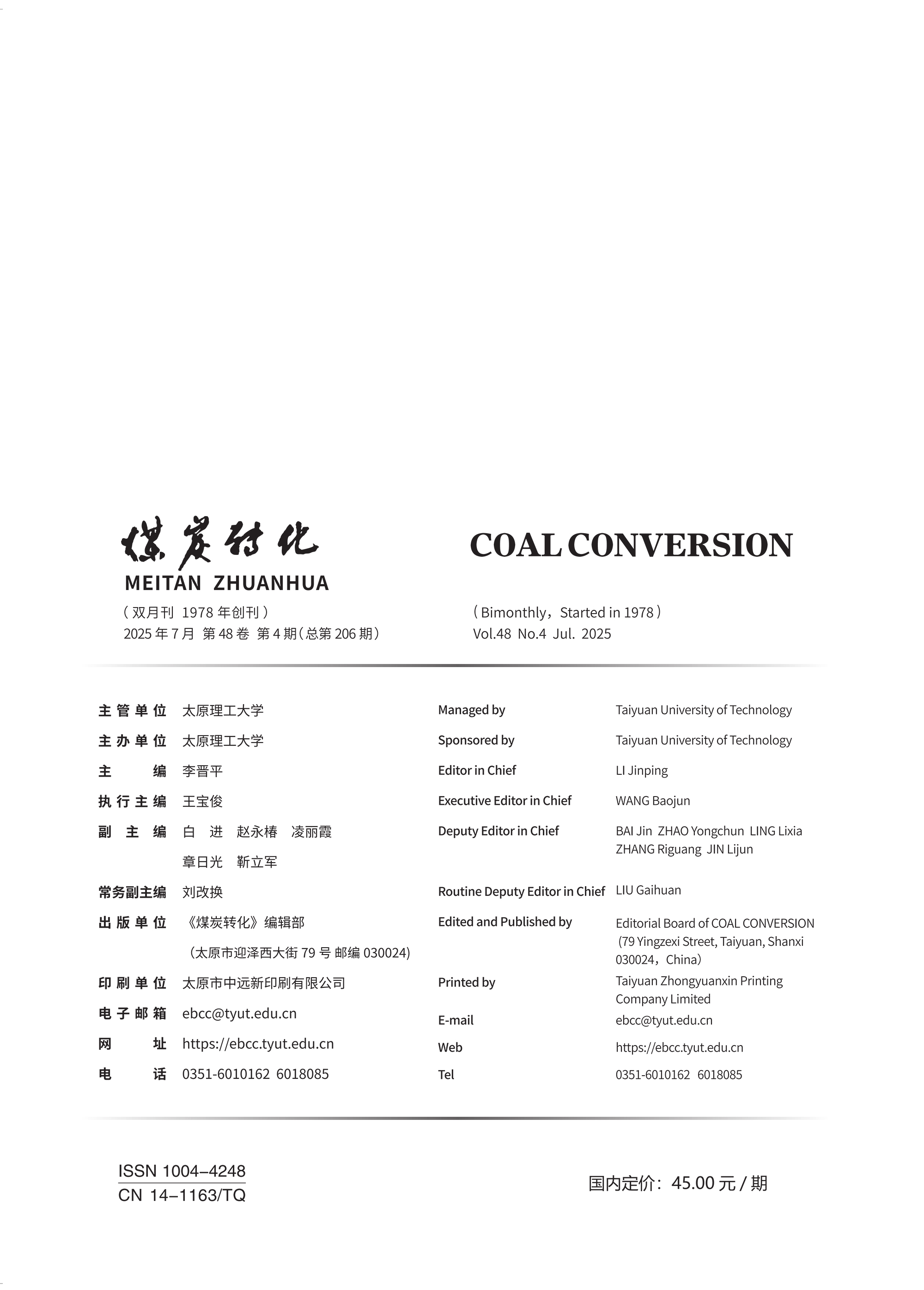 《煤炭转化》于1978年创刊,原刊名为《煤炭综合利用译丛》,主管主办单位为太原理工大学,刊期为双月刊。